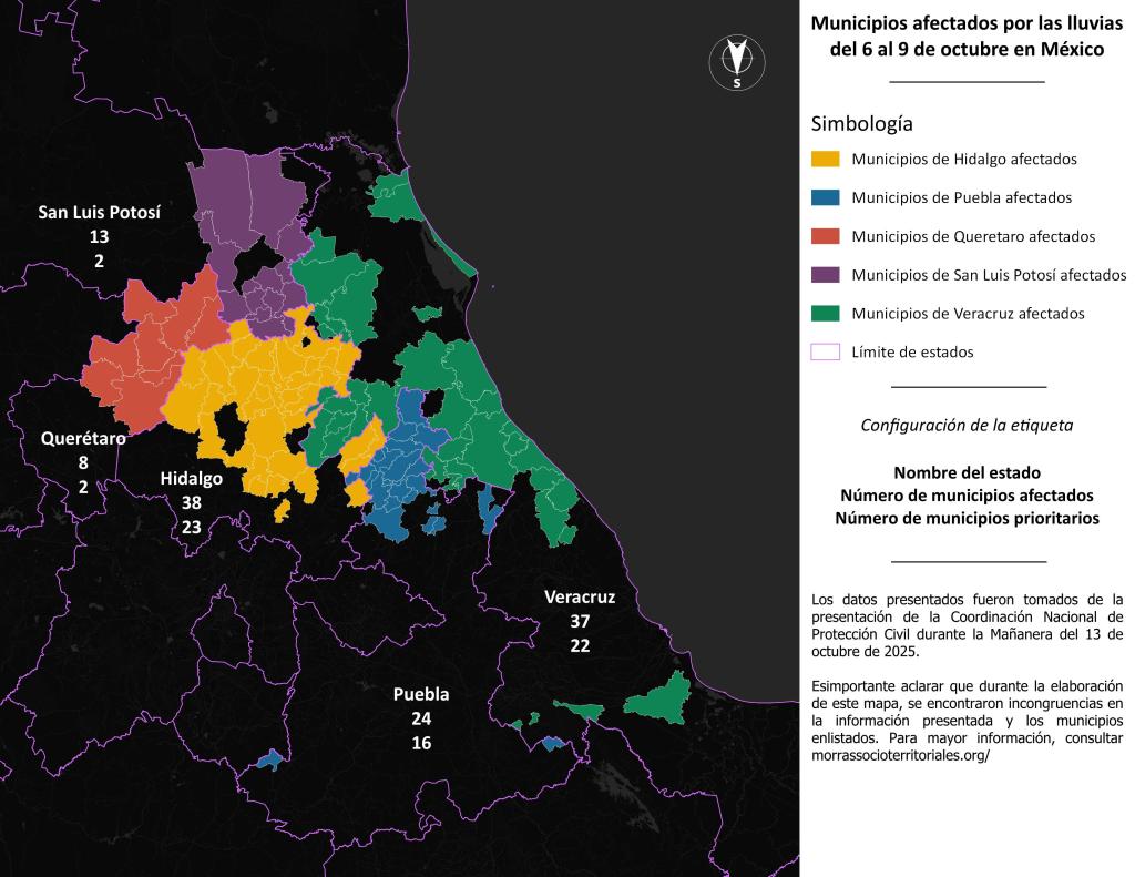 El mapeo presentado se hizo a partir de lo presentado en la Mañanera del 13 de octubre, en el que la Coordinación Nacional de Protección Civil, presento la lista de municipios afectados y prioritarios de cada estado, así como el número de personas fallecidas y desaparecidas.